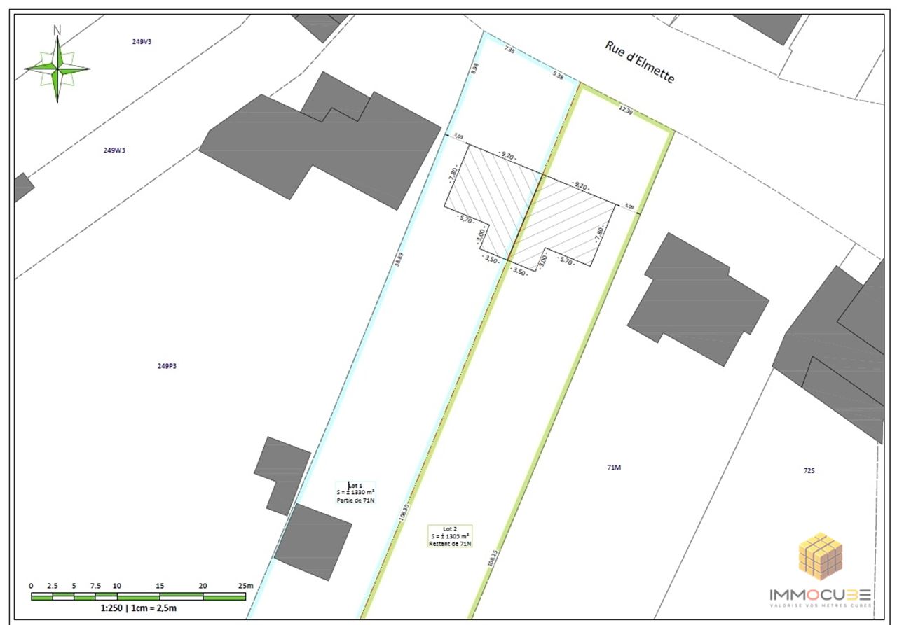 Il a une contenance de 2.727m² orienté plein sud. Au vu du cadre bâti et de la largeur à rue, la construction de deux maisons 3 façades semble envisageable. Une demande pour la construction d'une maison 4 façades peut également être introduite sous réserve de l'acceptation de l'urbanisme.